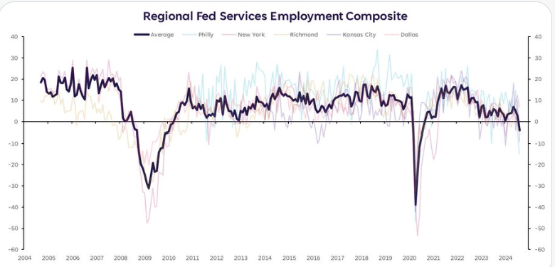 According to the BLS, 132 million workers are in the services sector, accounting for about 80% of private employment. Therefore, labor sentiment in the services sector is vital to track to help us forecast how the Fed might manage monetary policy going forward. To that end, the graph below, is a composite of the various Fed regional service sector employment indicators. Unlike those noted above, the regional Fed surveys are from hiring managers, not employees. Therefore, it sheds a slightly different light on the topic. As shown, the composite has fallen into negative territory. Over the last 20 years, the only times it has been negative have been leading up to recessions and during them.