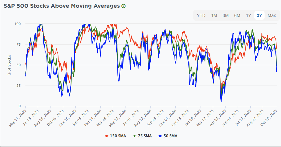 Yesterday, we touched on the market’s underlying breadth, which has recently worsened as the market has rallied. All of today’s commentary comes from SimpleVisor.com, and we can start with the chart of the number of stocks in the S&P 500 trading above their respective 50, 75, and 150 DMAs. As noted yesterday, that deterioration is very notable given that the index is ringing all-time highs.