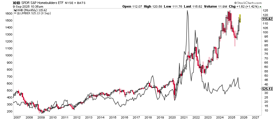 Yesterday morning, I noted the divergence between homebuilders and lumber prices. It is unusual that homebuilders are performing so well given the current housing market dynamics. More notably, if homebuilders were doing as well as stock prices suggests, lumber should be performing better. While previous divergences such as it is currently have existed previously, the magnitude of the divergence is notable. Either the “housing market experts” that are predicting a real estate crash are dead wrong or lumber prices are suggesting that a crash is coming.