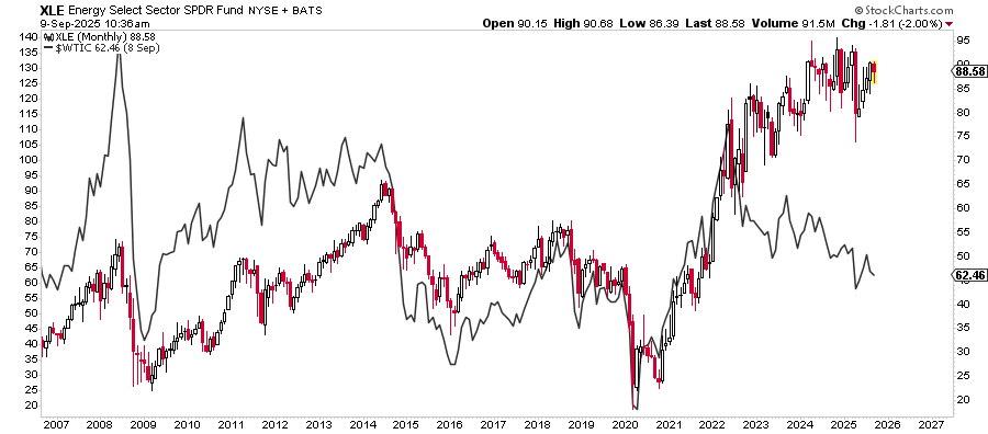 Interestingly, we see the same divergence in oil prices from oil stocks. Currently, energy stocks are priced well above the fundamentals of oil or we are about to see an economic resurgence that will push oil prices higher.