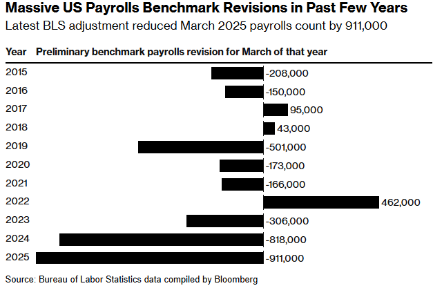 The BLS released its preliminary estimate of the annual payrolls benchmark revision yesterday, showing job growth for the 12 months ending in March was overstated by 911,000. While the figure grabbed headlines, it’s important to remember this is a preliminary estimate. The BLS won’t publish the final revision, which will adjust monthly payroll data from April 2024 to March 2025, until February 2026. Most notably, in recent years, the final revision has come in smaller than the first estimate.
