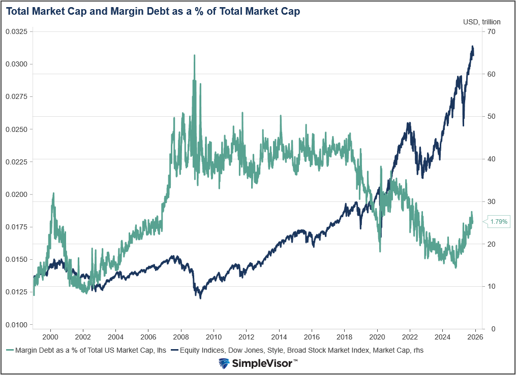 When stocks rise, the wealth effect kicks in, making investors feel richer. Accordingly, they become more confident and are more willing to borrow on margin to buy more stocks. Historically, there is a roughly 1 to 3 month lag between rising stock prices and an increase in margin debt. This lag creates a feedback loop: rising prices → higher account equity → more borrowing capacity → more buying → higher prices. Margin debt as a percentage of GDP or relative to market cap tends to peak very close to major market tops. This was true in 2000, 2007, and more recently in 2022.