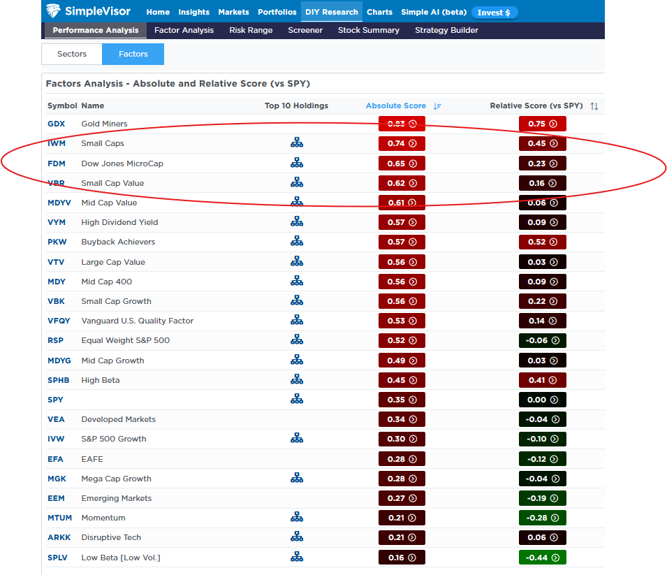 As we share in the SimpleVisor graph below, small cap stocks have grossly underperformed the market (S&P 500) since 2023. While that is also true this year, with the S&P 500 beating the Russell 2000 small cap index by about 4%, small caps have recently been coming back in favor. As we share below from our relative analysis, small cap stocks constitute three of the four most overbought stocks on an absolute basis and have some of the highest relative scores versus the S&P 500.