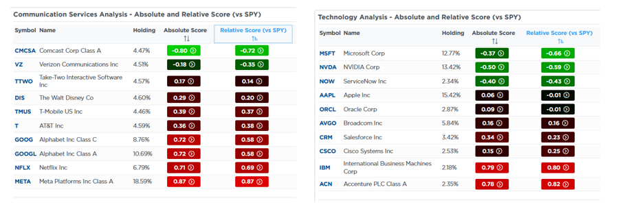 The technology sector is now the most oversold, while communications is the most overbought. Both sectors are significantly impacted by a few large contributors, as shown in the second set of graphics. For instance, Microsoft and Nvidia weigh on technology, while Meta and Google are outperforming.