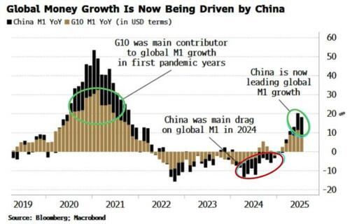 “Just as bubble risks elevate, valuations hit new all-time highs, and G10 excess liquidity falls, a rising flow of liquidity from China is set to offer support. It may not be enough to avert a correction that punctures some of the more extreme signs of feverish speculation, but it is likely sufficient to limit losses in the face of historic valuations. Money in China is now steering global money growth. After several false starts, stimulus there is finally breaking through more broadly, leading to a sharp and sustained rise in M1, driven by an increase in corporate demand deposits.”