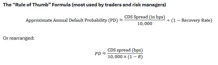 CDS stands for credit default swaps. These are derivative contracts in which one party, the default protection buyer, pays a quarterly fee, expressed in basis points. In return, the counterparty, or protection provider, assures that in the event of default, the buyer will receive par for their bonds. CDS spreads, or the cost of default insurance, provide the market with an easy way to quantify the implied market default probability. While simplified, here is the math to calculate default risk:
