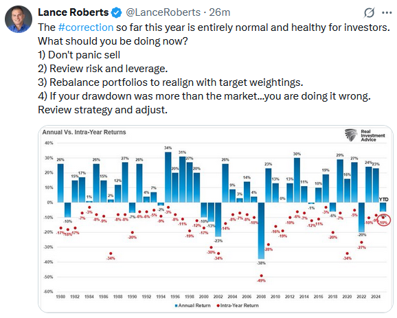 “However, despite the deep levels of negativity, the current correction is well within the context of the volatility seen during Trump’s first term as he engaged in a trade with China.”