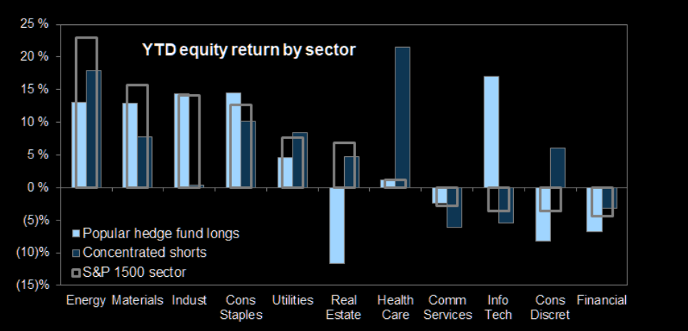 The rise in short interest is not necessarily an immediate alarm bell, but high levels of short interest have previously coincided with poorer returns. Recently, however, that short squeeze has affected nearly every sector. The most concentrated short positions have outperformed popular longs in 6 of 11 sectors YTD. Those sectors, of course, are Materials, Industrials, Staples, Transports, Utilities, and Energy. On the other hand, concentrated shorts have declined outright YTD in Communication Services, Info Tech, and Financials.