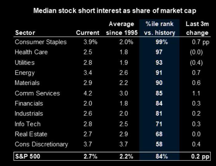 Yesterday, we discussed the technical backdrop of the market heading into this week. One interesting note about the current market is the sharp increase in short interest, which is now at very elevated levels. The median S&P 500 stock carries short interest equivalent to 2.7% of market cap, ranking in the 84th percentile since 1995 and the 97th percentile over the last five years.