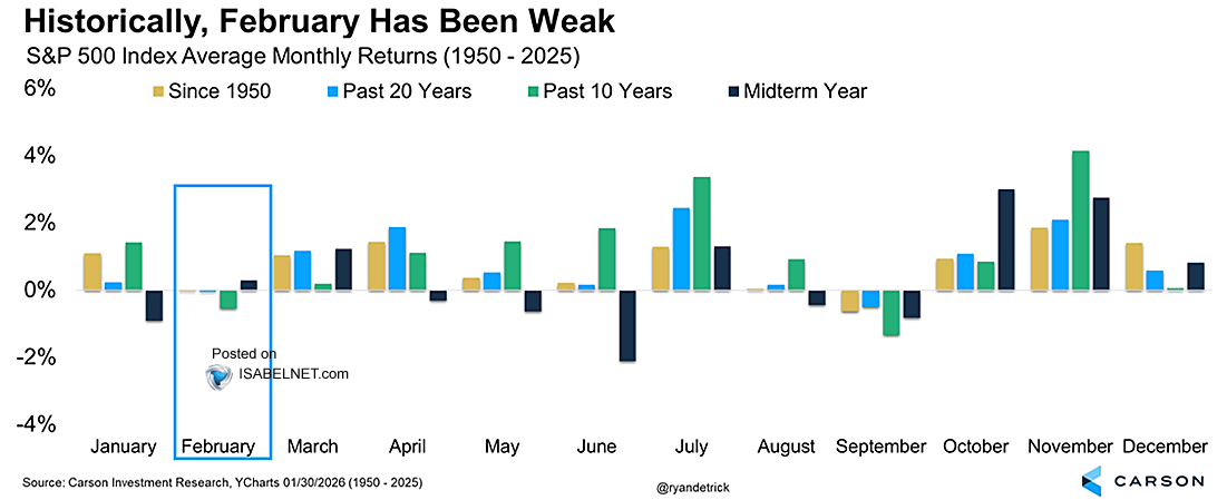 Yesterday, we reviewed the technical backdrop of the market. However, this is also the beginning of a new month, which happens to be one of the weaker months of the year. From a seasonality perspective, the month of February tends to have lower returns than other months of the seasonally strong period, and has about a 50/50 win rate.