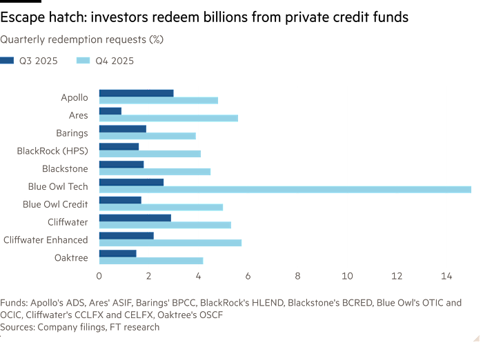 Private credit funds were all the rage in 2024 and 2025 as institutional and high-net-worth retail investors sought more risk and higher returns. Over the last few months, that trend has started reversing. The FT reports that private credit investors pulled more than $7 billion from some of the biggest private credit funds in the fourth quarter. While sizable, the amount withdrawn is small compared to the estimated $2.5 billion in the private credit industry, of which private credit funds account for over $500 billion. The graphic below, courtesy of the FT, shows the pickup in private credit fund redemption requests.