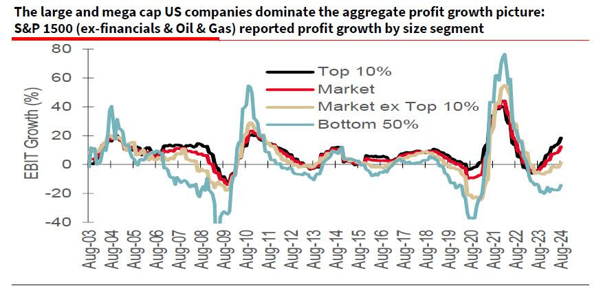 Notably, there is a stunning lack of earnings growth outside the top 10 largest companies in the S&P 500 index. According to Bank of America, while overall Q3 earnings growth was expected to be a modest 3-4%, this would be entirely due to a 19% increase in the “Magnificent 7” earnings. However, even those earnings are down from 37% in Q2 and down from 55% a year ago. The rest of the S&P500, some 493 companies, are expected to post another quarter of flat earnings.