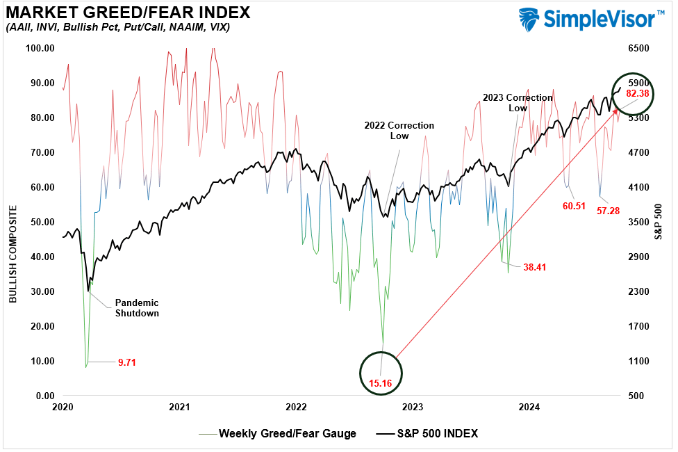 The “Fear/Greed” gauge is how individual and professional investors are “positioning” themselves in the market based on their equity exposure. From a contrarian position, the higher the allocation to equities, the more likely the market is closer to a correction than not. The gauge uses weekly closing data.