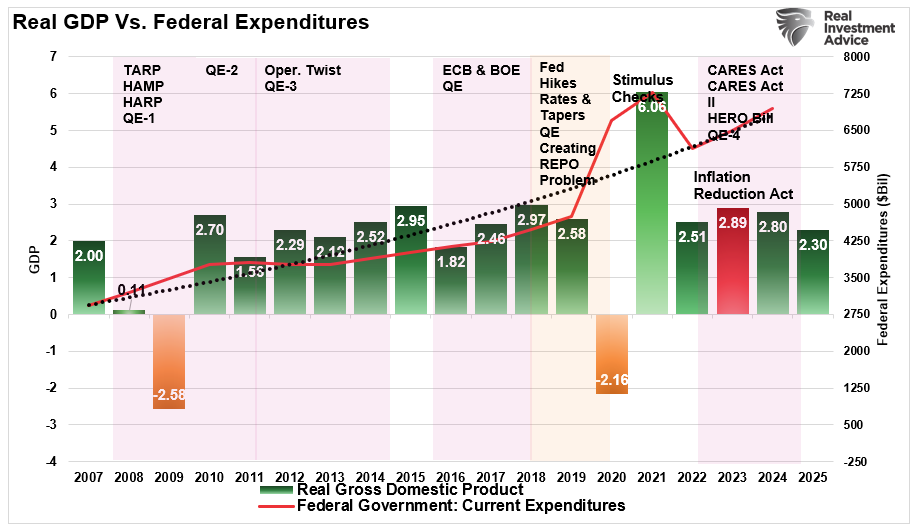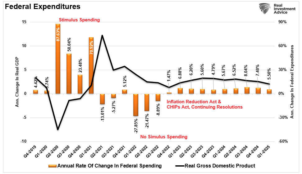 Furthermore, despite the hopes that DOGE would cut Federal spending, it has only returned to the post-financial crisis exponential growth trend as the Government continues to use “Continuing Resolutions” to fund the Government. These resolutions automatically increase government spending by 8% annually. In other words, spending doubles every nine years, so debt levels continue to rise, feeding into economic growth rates.