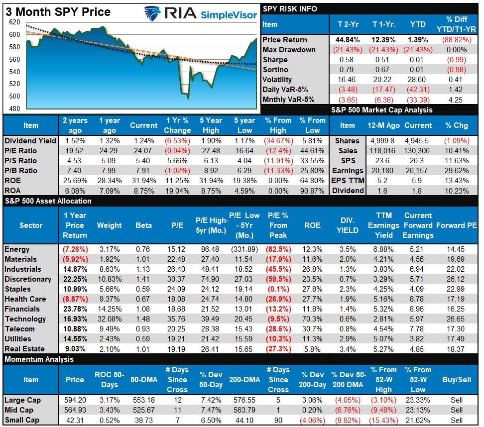 This past week, the market continued its advance. There is little reason to be bearish with key overhead resistance levels broken. However, as shown, the markets are reaching decently overbought levels after being extremely oversold. This suggests that at least for now, the “easy money” has been made. With the market above the 200, and above the 50 and 20-DMA, pullbacks should be between 5600 and 5800. Investors can use such a pullback to increase portfolio equity exposures and reduce hedges accordingly. Conversely, 5000 to 5200 becomes the next critical target if those lower supports are violated. However, such would require some unexpected event to unfold.