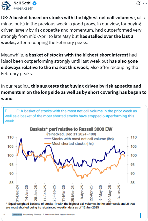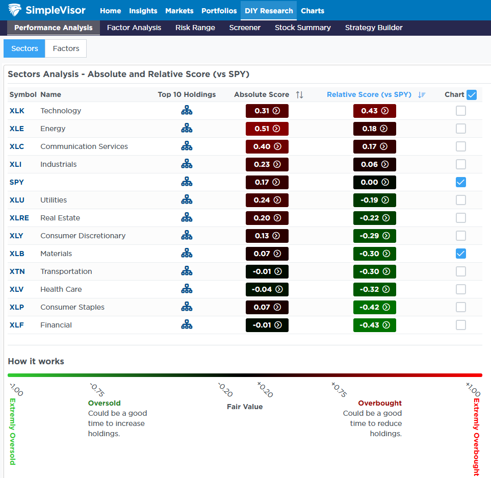 The outbreak of conflict between Israel and Iran last week boosted oil prices amid targeted attacks. The price of Brent Crude has since pulled back from its peak. Nonetheless, the increase boosted the energy sector compared to last week, when it was the most oversold sector versus the S&P 500. The table below from SimpleVisor shows that energy is now the second most overbought sector compared to the index. However, none of the sectors are particularly overbought on an absolute basis as the market recovers from last week’s slight drawdown due to the conflict.