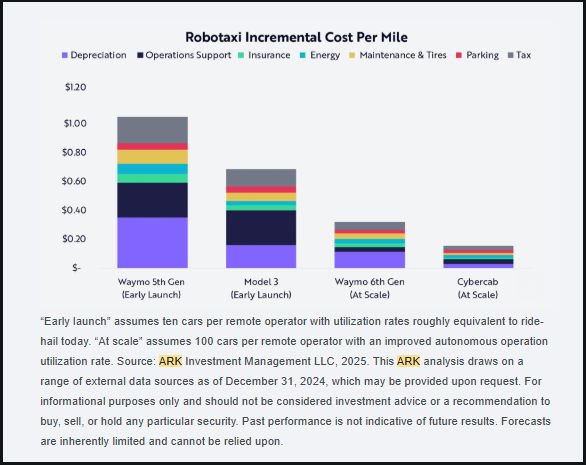 Waymo, backed by Alphabet’s $5 billion investment, relies on LiDAR and high-definition mapping. Tesla, by contrast, uses a vision-only system with cameras, aiming for a 30-40% cost-per-mile advantage, according to ARK Invest. This efficiency and Tesla’s vertical integration seek to drive scalability. Superior scalability could result in the robotaxi service representing 90% of Tesla’s enterprise value by 2029 per ARK’s projections.