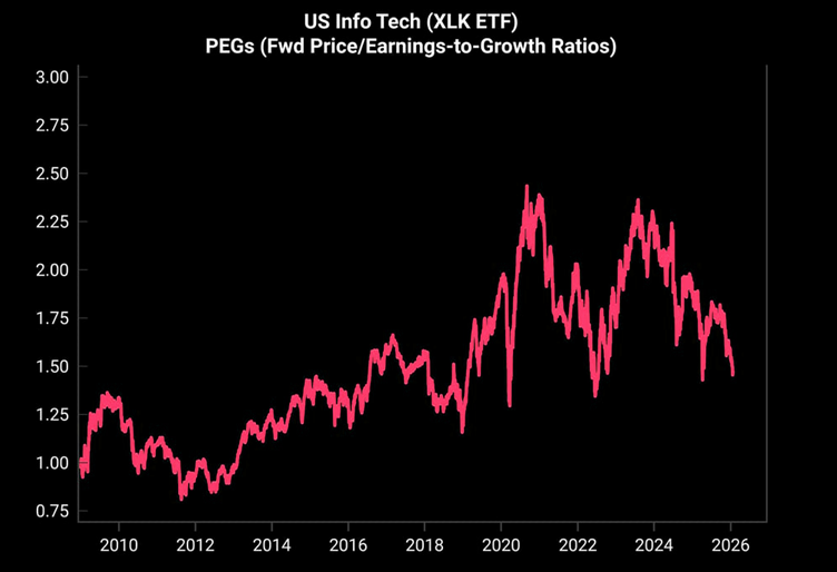 Starting on Friday, the market began a rotation back into technology names, which propelled the market higher on Friday and again yesterday. There are a couple of reasons the market is likely to rotate back into growth stocks, aside from the technical backdrop: US tech stocks have already seen a significant de-rating. With forward PEG ratios now trading near 5-year lows, the “froth” has largely come out of the sector despite the long-term growth story remaining intact.
