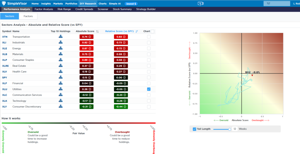 Over the last three months, we have seen a strong rotation from technology and communications toward more economically sensitive sectors, such as industrials, materials, and transportation. Moreover, value stocks have well outperformed growth stocks. However, while the rotation has included almost all of the sectors, the utilities sector has largely been left out. As the SimpleVisor graphic below shows, utilities are currently at fair value on our relative analysis basis. Further, the graph on the right side shows the sector has been rotating between oversold (bottom left) and fair value (middle).