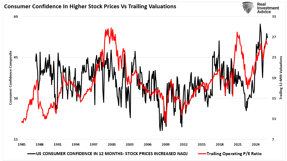 However, these speculative narratives have little to do with economic or fundamental realities that will ultimately drive outcomes. In markets, stories don’t replace valuation. As I noted previously, when “valuation metrics are excessive… it is a better measure of investor psychology than fundamentals.” That means price becomes more about sentiment than business results, and we see that in the relationship between consumer sentiment about stock prices over the next 12 months and valuations.