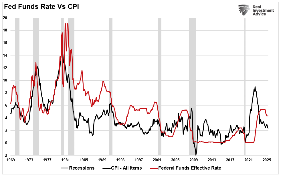 However, the Fed’s mistake wasn’t the “transitory” label—it was the Fed’s late response to raising interest rates and halting quantitative easing. As shown, the combined impact of the massive surge in the Government’s deficit spending (stimulus checks and infrastructure bills) and the Fed’s $120 billion monthly “quantitative easing” campaign caused a massive jump in economic growth and inflation. However, instead of cutting back on stimulus when the economy rebounded, the Fed’s mistake was keeping its “foot on the gas” for too long. These delays allowed the inflationary fire to burn hotter and longer than necessary, exacerbated by an overlooked driver: excessive government spending.
