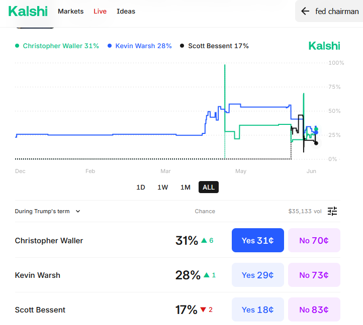 The Kalshi graphic below shows betting odds favor Waller slightly over Warsh.
