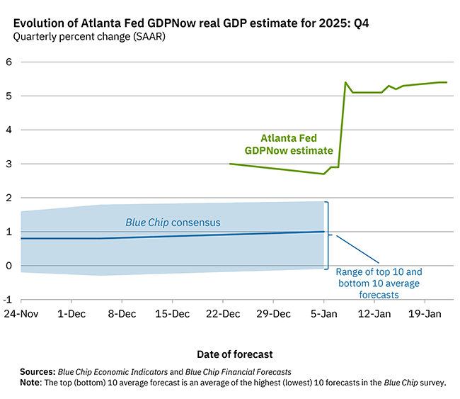 The BEA revised the third-quarter real GDP to show a 4.4% annualized rate, the fastest growth in two years. Currently, the Atlanta Fed’s GDPNow, shown below, pegs fourth quarter GDP growth at over 5%. At the same time, yesterday’s PCE price index data show tame inflation. Core PCE, the Fed’s preferred measure of underlying inflation, rose 0.2% in November from the prior month, equating to 2.4% annually.