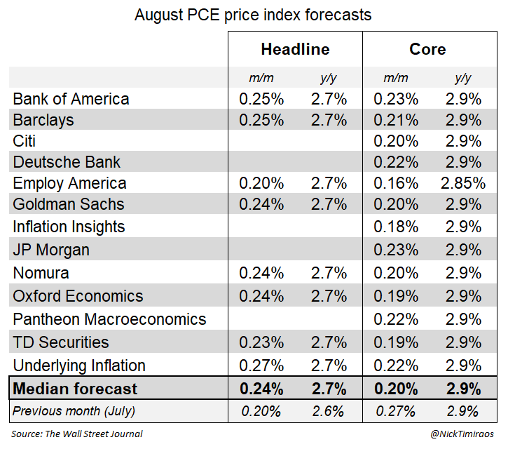 PCE prices will be released on Friday. PCE is typically easier to forecast than CPI or PPI, as much of the data used to calculate PCE is derived from those reports. As the graph below shows, the median estimate is .24% for the headline PCE figure and .20% for the core. Such a trend would continue to point to sticky inflation, but not an upward trend as some fear.