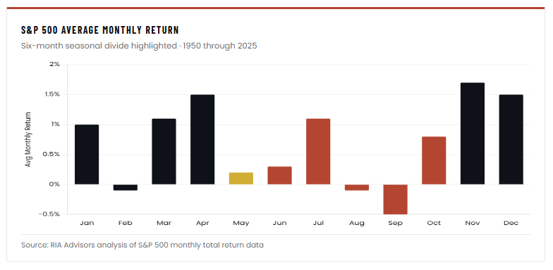 The data is clearer than most realize. Since 1950, May has averaged a return of roughly 0.2% for the S&P 500, essentially flat. That’s not the headline. The headline is what comes after. The May-through-October stretch has historically delivered an average gain near 1.7%, while the November-through-April period averages closer to 7%. The seasonal pattern isn’t superstition. It’s a real performance gap that has persisted across 7 decades of market data. However, as you will note in the chart below, it is the August and September weakness that spoils the summer fun, as May, June, and July tend to post positive returns, especially July.