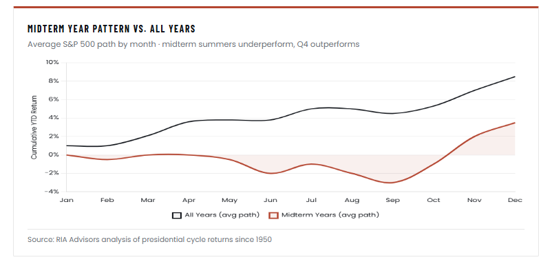 This year, the calendar matters more than usual. 2026 is a midterm election year, and midterm cycles carry their own seasonal fingerprint that overlays cleanly on the May weakness. Since 1950, the second and third quarters of midterm years have produced the worst stretch of the entire four-year presidential cycle. Average peak-to-trough drawdowns in this window range from 15% to 17%, with the cycle low typically forming in late September or October, followed by a sharp Q4 reversal. The year after a midterm has averaged a gain of more than 30%, which is exactly why patient traders treat midterm summer weakness as a setup, not a catastrophe.
