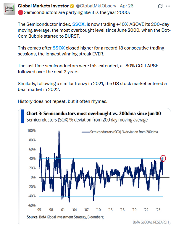 The Philadelphia Semiconductor Index (SOX) is on an incredible 18-day winning streak. Over this period, starting on March 31st, the SOX index has risen by 44%. This marks the longest winning streak in the index’s 32-year history. Moreover, it is now up 150% year over year, exceeding its 100% year-over-year gain during the dot-com boom. The Tweet of the day shows it is now the most extended versus its 200-day moving average since 2000. So what’s driving the incredible gains? The catalyst seems to be a combination of geopolitics, followed by yet another investor chase into a theme.