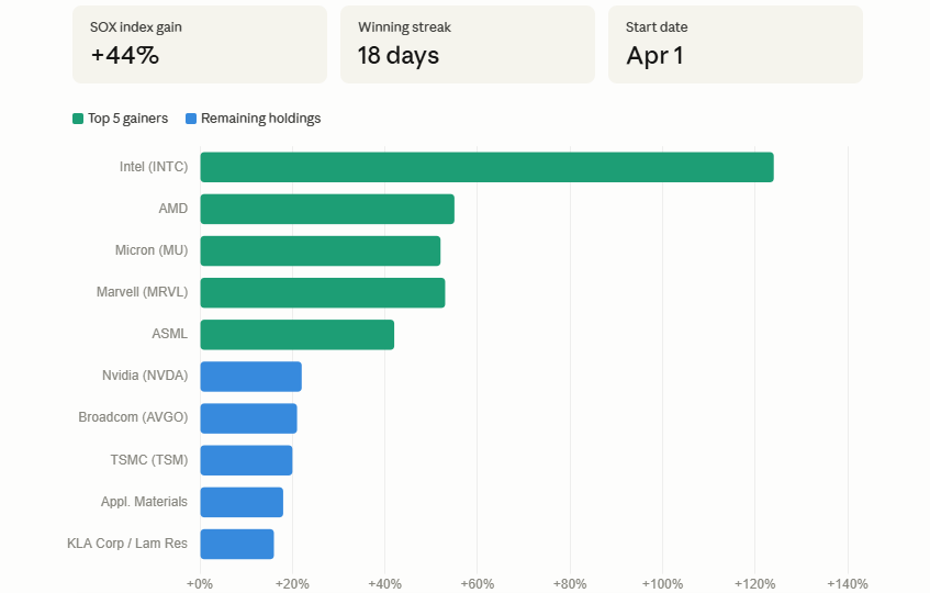 The SOX rebound has been turbocharged by investors chasing the AI theme. Fundamentals do support some strength in the rally. To wit, global semiconductor spending is projected to hit $1.3 trillion in 2026, a 64% year-over-year increase. However, the rally has driven the index and many underlying stocks to extremely overbought levels. A pullback, or at a minimum a consolidation, is likely at this point. Below, we share the gains since April 1 of the top ten SOX holdings.