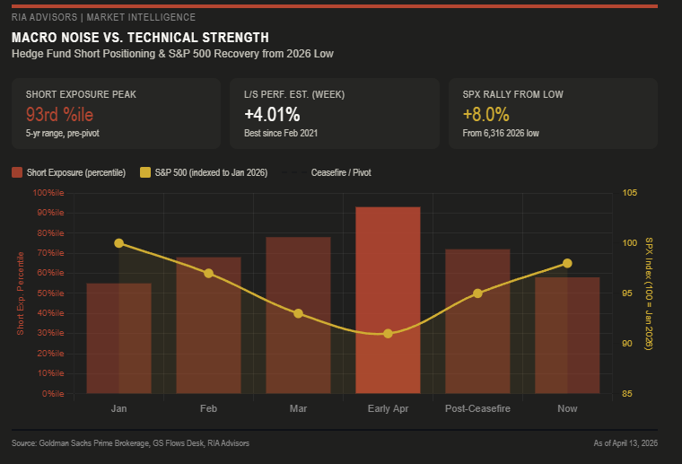 That pivot makes sense from a mechanics standpoint. Short exposure across U.S. macro products, index futures, and ETFs had climbed to the 93rd percentile over the past five years, with hedge fund gross exposure near an all-time high of 307%. When the Iran ceasefire headlines crossed, that positioning became a coiled spring. Shorts covered, hedges unwound, and global equities were net bought for the first time in eight weeks, with Goldman’s Equity Fundamental Long/Short Performance Estimate rising 4.01%, the best weekly reading since February 2021.
