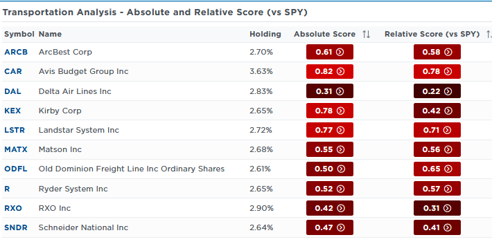 Avis Budget Group Inc. was up an astonishing 64% last week and a whopping 200% over the last month. A massive short squeeze is deemed the impetus behind its outsized move. Its 3.6% weighting in the transportation sector (XTN), coupled with its massive surge, helped the sector become overbought. However, the other top ten holdings are also overbought despite the negative impact that higher fuel prices will have on many of the companies. We share this in the second graphic, courtesy of SimpleVisor.