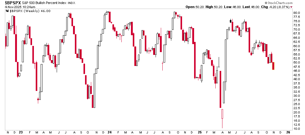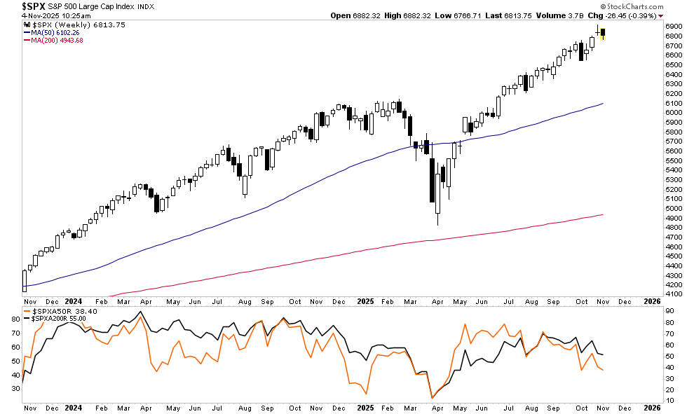 However, there are also concerns with that outlook, particularly when there are indications of a breakage of internal momentum in the market. As shown in the first chart below, despite the market still being near all-time highs, the number of stocks on “bullish buy signals” is deteriorating rapidly. Just FYI, you saw the same thing heading into the “Liberation Day” sell-off in April.