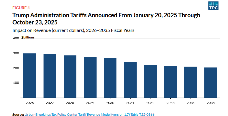 If the tariffs remain in place, the market reaction may be minimal. If they are repealed, some of the lagging sectors, such as consumer staples and autos, may benefit. Personal consumption has been weakening due to the minimal labor market growth, poor sentiment, and inflation. Tariff removal could improve inflation-related sentiment and potentially restore job growth. Exporters may struggle as the market perceives that the US has less leverage to force our products into foreign markets. Similarly, sectors shielded from foreign competition, such as steel and aluminum producers, could slump on such news. Treasury bonds could see yields rise as the government faces a larger deficit, since tariff revenue, estimated at over $2 trillion over the next decade, will vanish. The graph below charts the federal tax revenues expected by the Urban-Brookings Tax Policy Center over the next ten years.