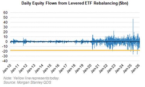 “Finally, mechanical supply also exacerbated today’s moves and has the potential to do so going forward: Levered ETF rebalancing translated to roughly $18bn of US equity supply on the day — placing today in the top 10 largest levered ETF supply days on record, with a large share concentrated in NDX/Tech/Semis and meaningful single-name impacts (TSLA, NVDA, MU, PLTR, AMD, IREN each >$100mm).” – Morgan Stanley