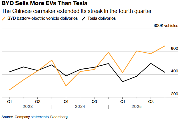 Tesla EV deliveries totaled 1.64 million vehicles in 2025, leaving the company behind China’s BYD, which delivered more than 2.2 million EVs for the year. The result marks a second consecutive annual decline in Tesla EV deliveries, reinforcing the growing pressure on the company’s core automotive business. Fourth-quarter deliveries fell sharply year over year, underscoring the slowdown.