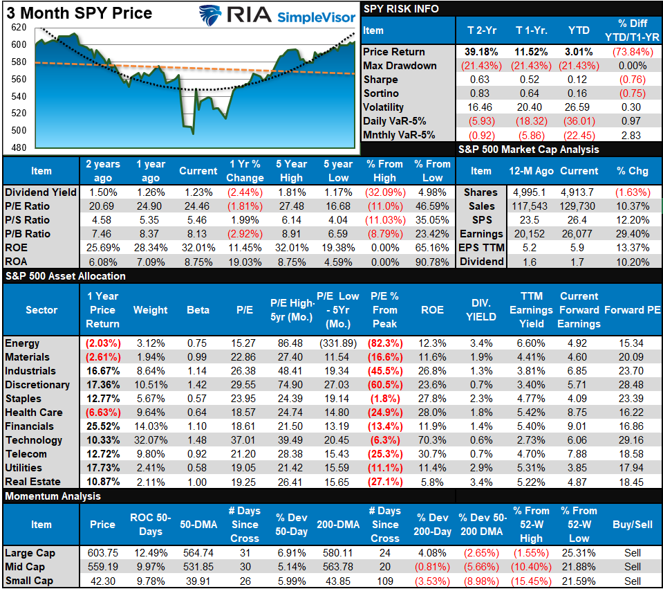 While the market broke out of its consolidation range this past week, many sectors remain above normal risk ranges. Particularly, Energy, Technology, and Healthcare, which were previously laggards. You should review the relative analysis table above, which shows which sectors are lagging or leading the broader market. With regularity, previous laggards become leaders and vice versa. We remain concerned about most markets and sectors being on bearish weekly signals. While there seems to be minimal risk to the market, historically, the large number of bearish crossovers suggests that risk is not absent. Continue to trade cautiously and hold higher-than-normal levels of cash.