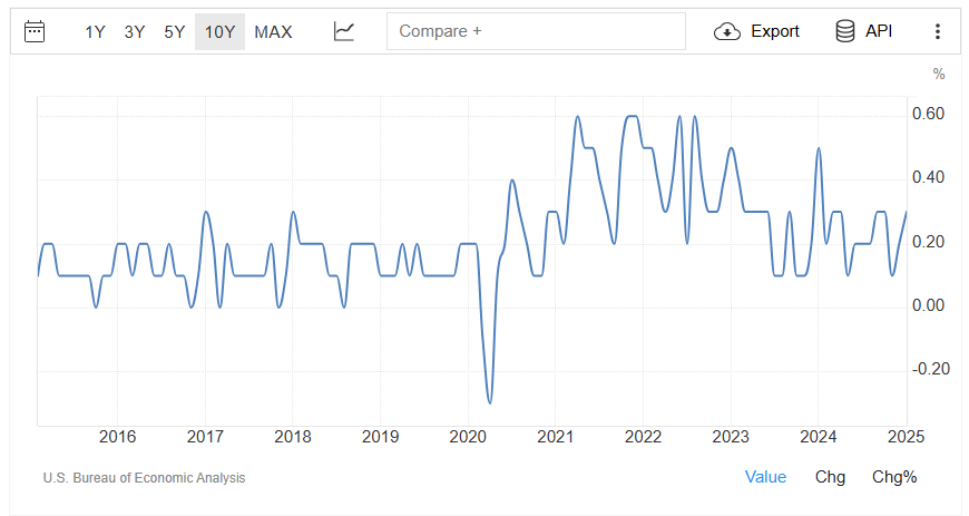 This week features several economic data releases after last week’s FOMC meeting, during which the Fed held rates steady and adopted a dovish tone. The main event comes on Friday with PCE prices, the Fed’s key measure of inflation. Forecasters expect both core and headline PCE prices to rise 0.3% MoM in February, commensurate with January. Core PCE inflation, shown below, remains sticky above the Fed’s target. The consensus estimate for personal income is a 0.4% increase MoM, down from 0.9% in January. Meanwhile, the consensus expects personal consumption to improve to 0.6% MoM from -0.2% in January.