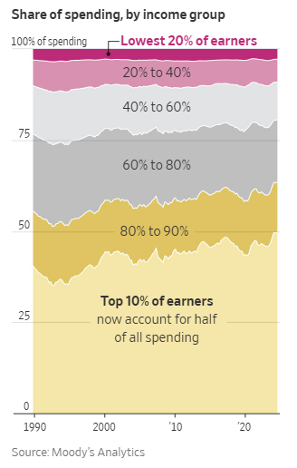 The wealth effect is particularly relevant to higher-income households today. According to S&P Global, the top 10% of households by wealth held nearly 88% of stock and mutual fund shares as of Q3 2024. Furthermore, according to the Wall Street Journal, roughly 50% of all consumption in the US comes from the top 10% of American earners. Accordingly, the wealth effect may be the first domino in a chain of events that brings inflation back toward the Fed’s target. Per the WSJ: