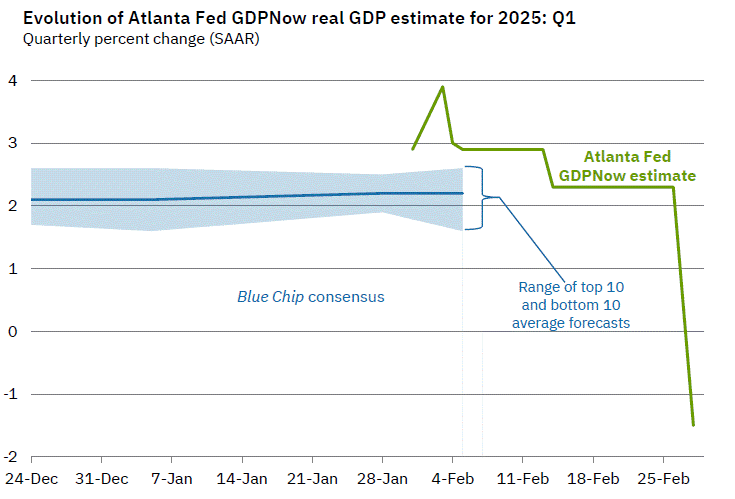 The steep decline, mainly due to tariffs, will likely normalize over the coming months. The import demand will be less than typical as inventories for specific products are now bloated for those frontrunning the tariffs. However, the trade deficit data will negatively impact GDP. The formula for GDP includes exports minus imports. The Atlanta Fed GDP Now estimate for first quarter GDP fell sharply from 2.3% on February 19 to -1.5% on Friday, after the trade deficit report.