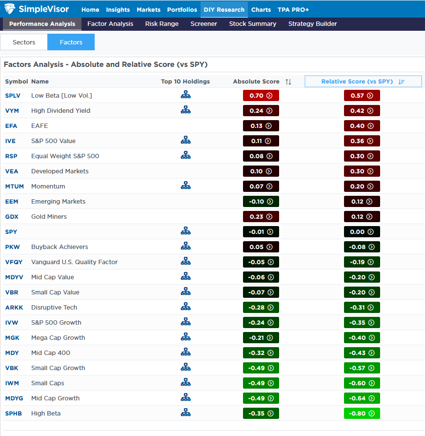 As the first table from SimpleVisor shows, value stocks continue to lead the way. Moreover, larger-cap value stocks are outperforming small and mid-cap value stocks. The second table shows that financials, consumer staples, healthcare, and real estate are the most overbought sectors versus the S&P 500. Technology, representing growth stocks and the most significant contributor to the S&P 500, is the most oversold sector, alongside transportation stocks.