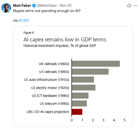 It’s not just Google developing TPUs. Meta Platform has its own chip, MTIA, to handle its Generative AI workloads. Amazon’s Tranium also performs similar tasks. Given how the stock market has rewarded Google of late, it’s a good bet that efforts to develop further TPUs will intensify. These new challenges question the assumptions underpinning Nvidia’s premium margins and the “everybody wins” narrative embedded in some Magnificent Seven valuations. To wit, consider the following from John Authers of Bloomberg: