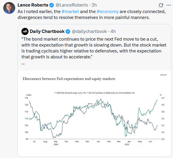 However, we are starting to see some cracks in that particular trade, which could result in a more significant market correction over the next few months. Notably, the timing of that potential unwind is the most difficult. The problem with momentum is that, like a speeding locomotive, it is tough to stop. As such, it can take some time for the cracks in the “momo” trade to show up in the broader market. Given the high levels of complacency, there seems to be a more substantial risk of something breaking today, versus what we saw back in early April.