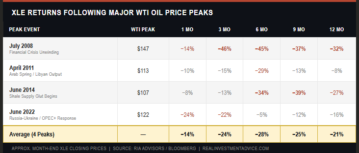 The average across all four peaks tells the story cleanly. XLE loses roughly 14% in the first month following an oil price top, deteriorates to nearly 28% below peak by six months, and then stages a partial recovery to close down around 21% at the 12-month mark. The six-month window is consistently the worst entry point for anyone who chased the commodity spike.