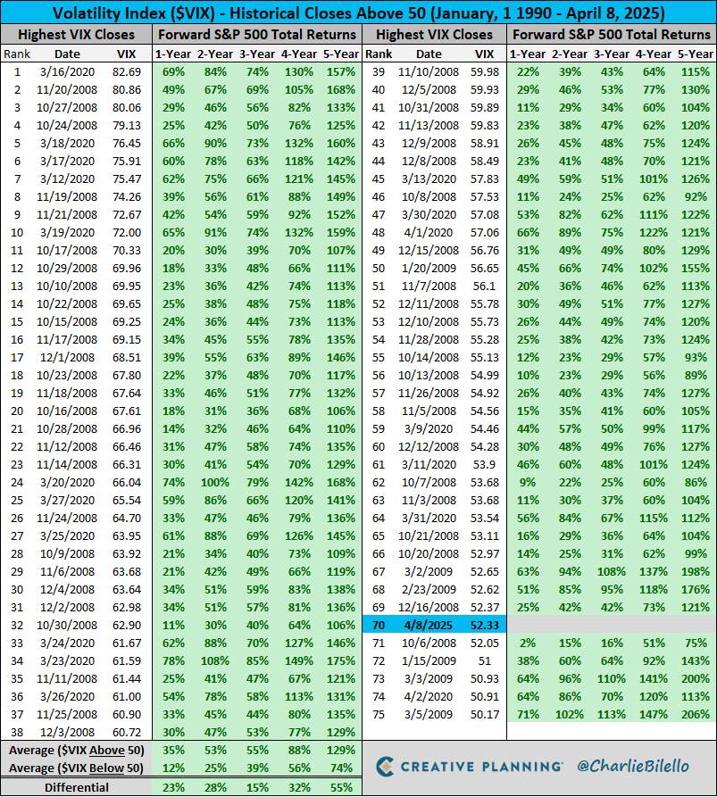 Yes, high volatility may be a good thing. Today, that statement may be hard to fathom. Moreover, it’s likely that stock returns over the coming weeks and months will be poor. However, as we share in a table courtesy of Charlie Bilello, since 1990, when volatility spikes above 50, longer-term returns have always been good. The 75 instances following the VIX spiking above 50 have consistently produced positive returns over the next 1-5 years. This bodes well for those able to shut their eyes and ignore markets. However, for the rest of us, there are risks. For example, you will see many dates below from the fall of 2008. During the Lehman bankruptcy and related financial market carnage, volatility spiked. Markets didn’t set the ultimate low until March of 2009. Those that bought on the spikes above 50 faced a gut-wrenching decline, but if they held, they ultimately did well.