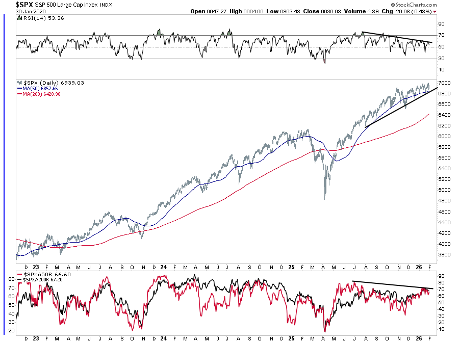 The S&P 500 closed the week at 6939, pulling back slightly from the highs it tested earlier in January. Price action remains constructive and in a bullish uptrend. However, recent sessions reflect continued resistance at all-time highs. Furthermore, market internals have softened, with relative strength negatively diverging from the bullish market trend. Such divergences typically precede weaker market outcomes, particularly when leadership has narrowed as earnings reactions from large-cap names have turned more mixed. While the index still holds above its key moving averages, the slope has flattened.