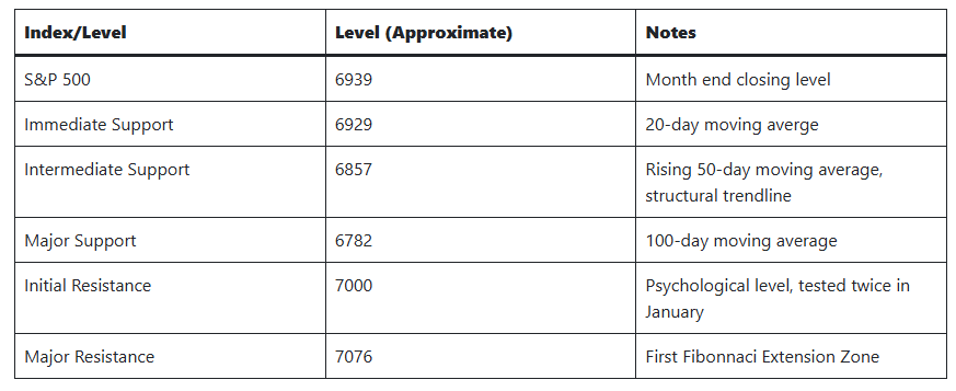 Volatility picked up last week, with daily intraday swings widening. The VIX remains suppressed, but skew has risen, suggesting investors are hedging downside risk. Options markets show increased demand for protection heading into this coming Friday’s January Employment Report. Technical support now sits near 6857, the 20-day moving average. A decisive break below would shift the short-term bias from neutral to defensive. Resistance remains firm at 7000. That range has rejected the price twice this month. A close above that level would suggest renewed upside momentum, especially if supported by strong earnings and macro data.