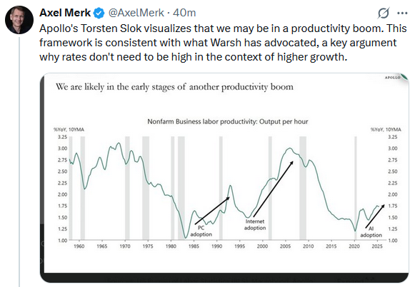 - Warsh believes that AI will unleash a productivity boom, leading to higher real wages, a lower debt-to-GDP ratio, and “be a significant disinflationary force, increasing productivity and bolstering American competitiveness.“